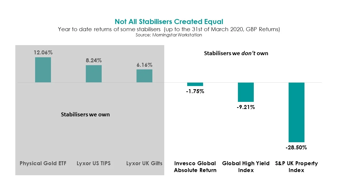 The most important feature of a stabiliser asset is that it has some measure of predictability in performance during periods of distress. For example, some of our peers’ class high yield bonds as stabilisers. This thinking is of course flawed because during periods of distress like we are currently facing, high yield spreads increase, meaning bond prices have fallen. A stabiliser asset cannot lose its value right when you need it the most.
