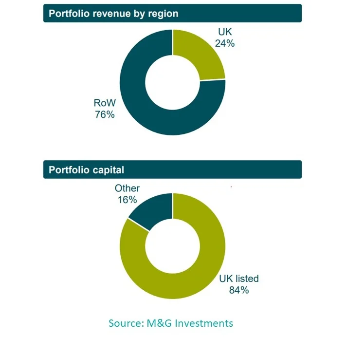 The M&G Recovery fund has 84% of its holdings listed in the UK. All this means is that 84% of the fund’s equity holdings are in companies that have their main listing in a UK exchange. As shown in the diagram below, the vast majority of revenue generated by these companies comes from outside the UK.